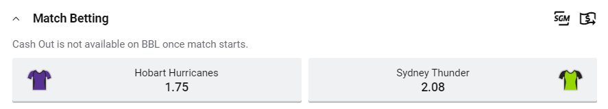 The Thunder need experienced campaigners Callum Ferguson and Usman Khawaja to reclaim their early-season form. Meanwhile, it’s hard to argue with the Hurricanes’ $1.76 favouritism.