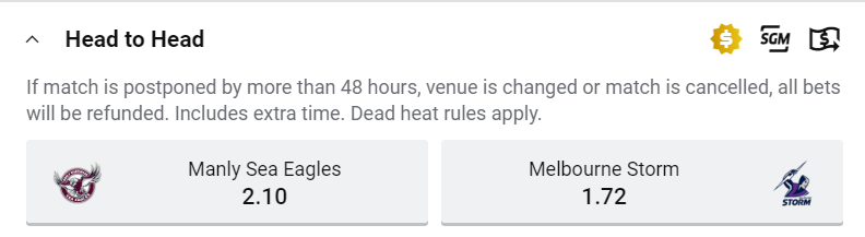 We take a look at Sunday evenings (15/3/2020) NRL 2020 Week 1 match is between the Manly Sea Eagles and Melbourne Storm. The Melbourne Storm go into this match as favourites.