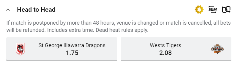 We take a look at Sunday evenings (15/3/2020) NRL 2020 Week 1 match is between the St George Illawarra Dragons and Wests Tigers. The Wests Tigers go into this match as clear favourites.