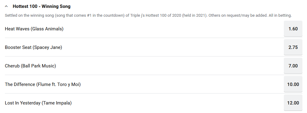 For the rest of you jumping on the Hottest 100 bandwagon for another year and wanting to back the winner, we give you a form guide of the Top 10 contenders* according to our betting market to give you a bit of insight so you can appear to know what you are talking about.
